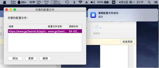 - 点击【确定】后会自动更新订阅,出现订阅更新成功通知:【重载配置文件成功】通知