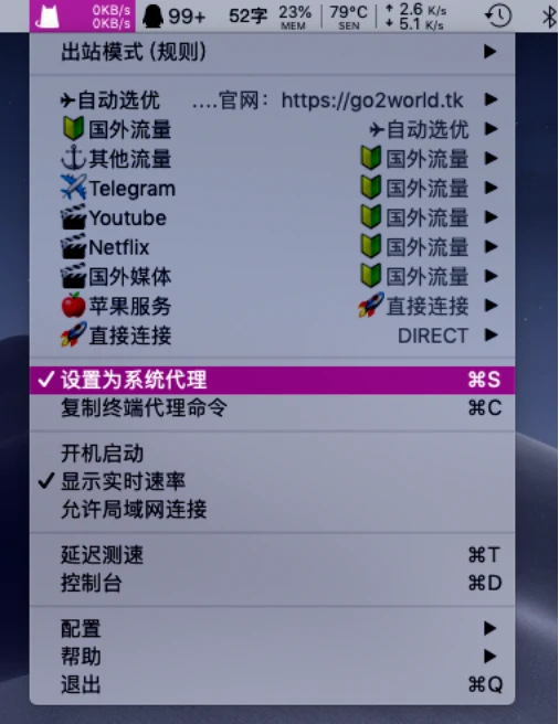 - 订阅更新后自动出现如下节点,点击【设置为系统代理】就完成了