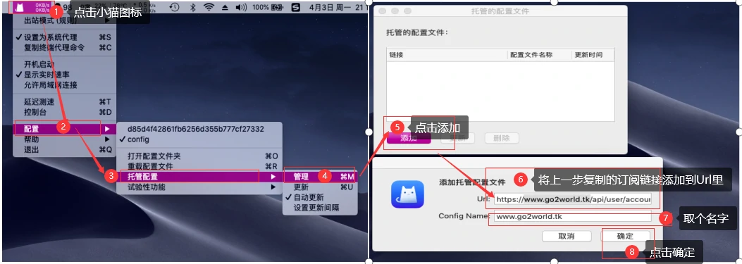 - 依次点击任务栏里的【小猫图标】-》【配置】-》【托管配置】-》【管理】-》弹出框【添加】-》弹出框Url(将订阅添加到此处)-》【确定】